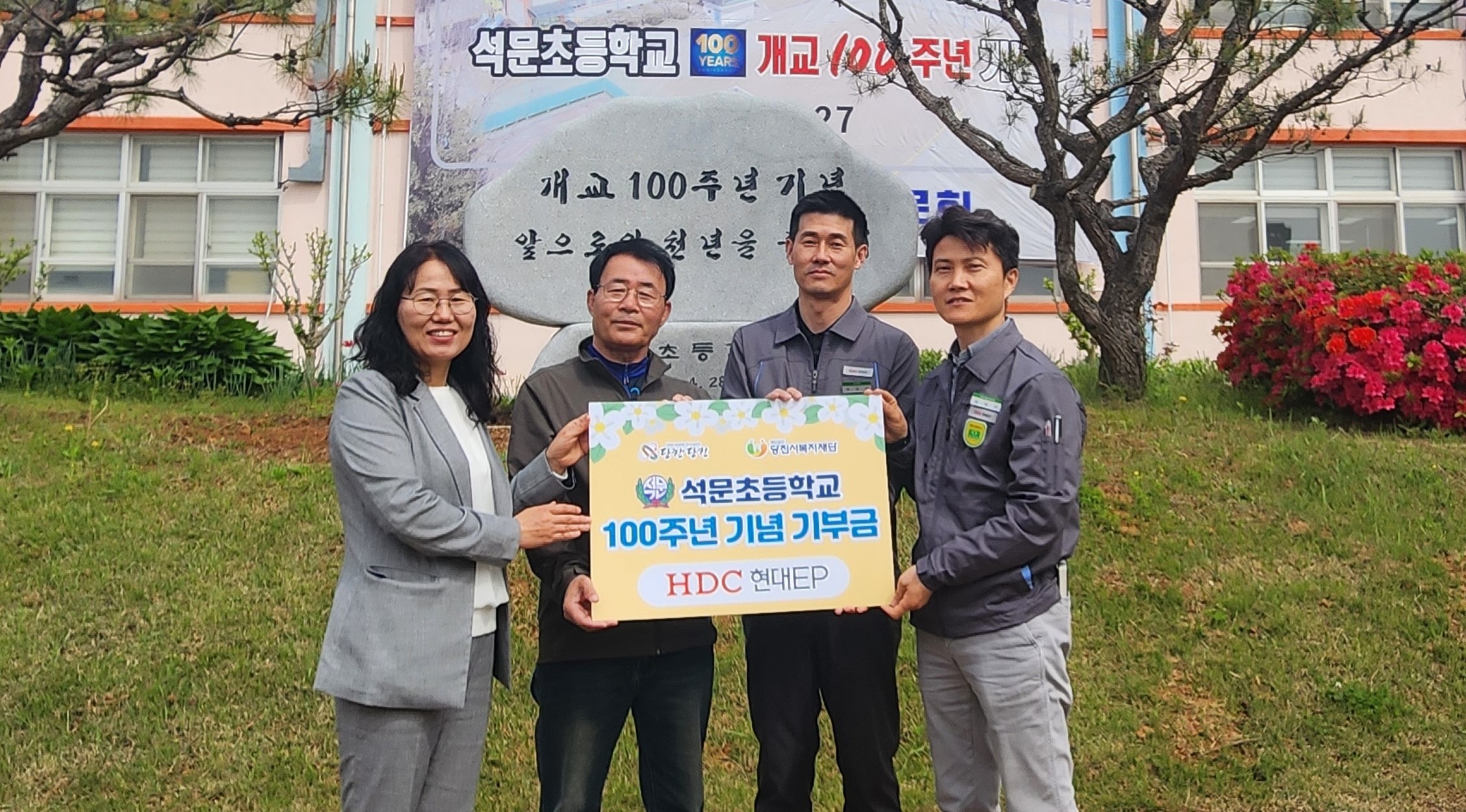 Left of the photo) Vice-principal Lee Jae-sook of Seokmun Elementary School, Chairman Ryu Jae-il of the General Association, Jang Won-jin, factory manager of HDC Hyundai EP Dangjin Plant, and Kwon Yang-geun, head of the safety and environment team, are taking photos to commemorate the 100th anniversary of the school's opening.
