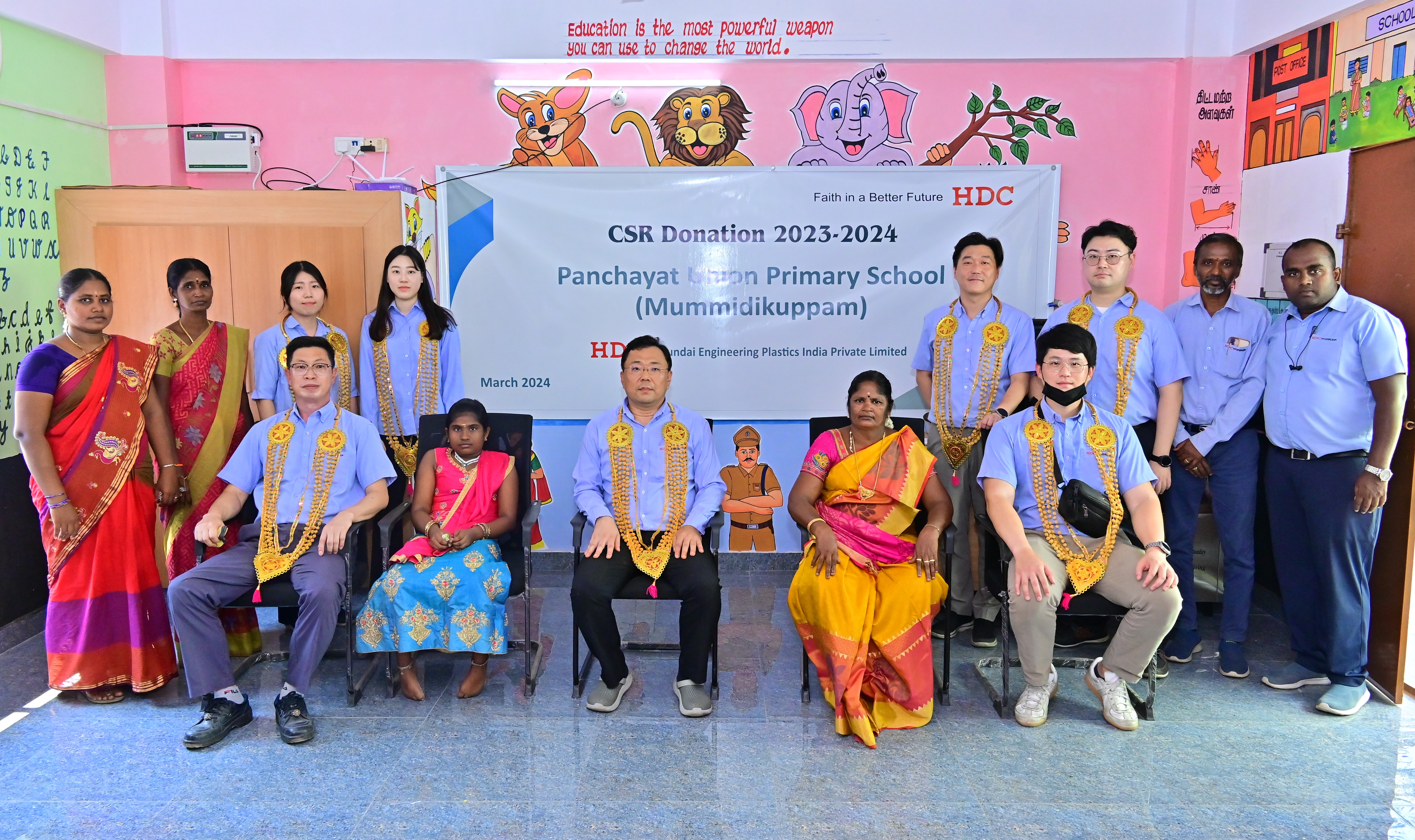 HDC Hyundai EP India Corporation Chairman Kim Bum-ho (center) and Panchayat Union Primary School officials are taking photos to commemorate the completion.