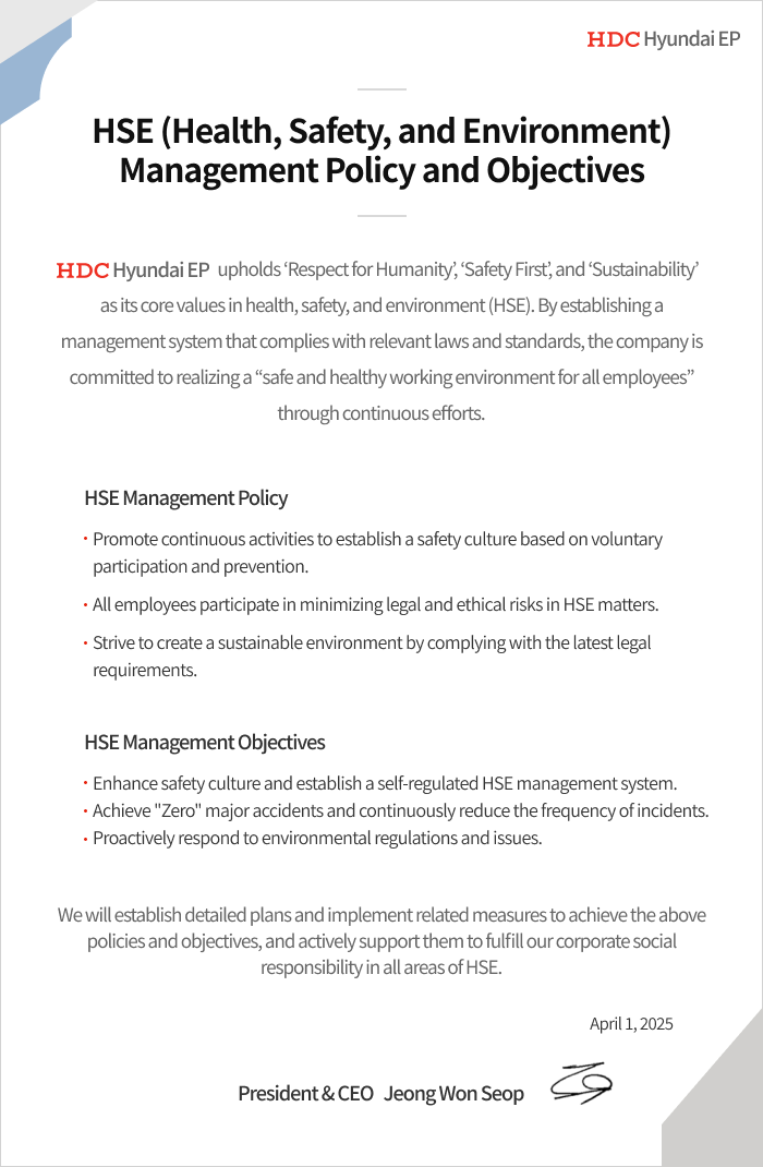 | Process Safety Management | ㆍSafety inspection by external experts and PSM specialized consulting ㆍInspection of PSM implementation status, internal inspections conducted |
